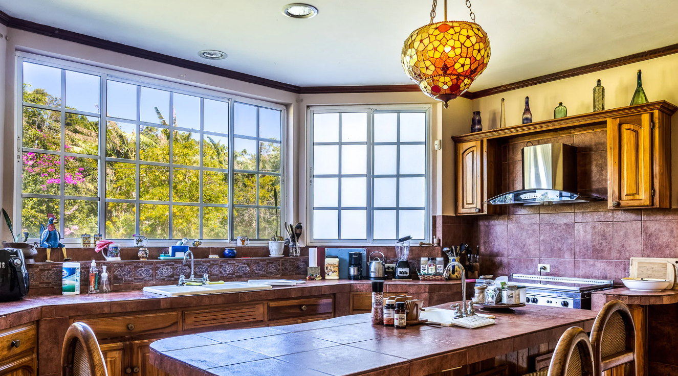 The kitchen is equipped with ample workspace, spacious countertops, and a center island that provides more space for cooking or can be used as a breakfast bar. The large windows allow you to enjoy the beautiful views while you prepare delicious meals. The wooden cabinets and ample storage space add to its charm.